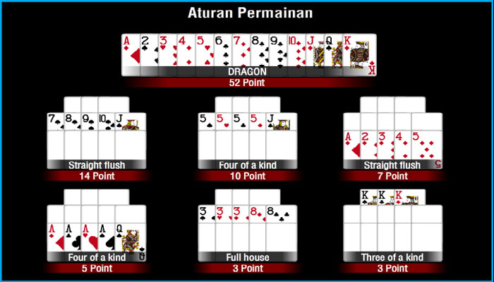 Cara permainan capsa susun harus disusun berurutan seperti tingkatan ketiga atau susunan paling bawah harus lebih besar dari tingkatan kedua atau susunan ditengah. Untuk tingkatan paling atas atau tingkatan pertama harus mempunyai angka yang lebih besar dari lawan misalkan player A mempunyai angka kartu A,A,2 dan player B mempunyai kartu K,K,2 makanya untuk hitungan susun diatas dimenangkan oleh player A. Contoh keterangan nomor 1,2,3 dan seterunya adalah susunan kartu dari terbesar hingga susunan kartu paling terkecil dalam susunan permainan capsa susun.